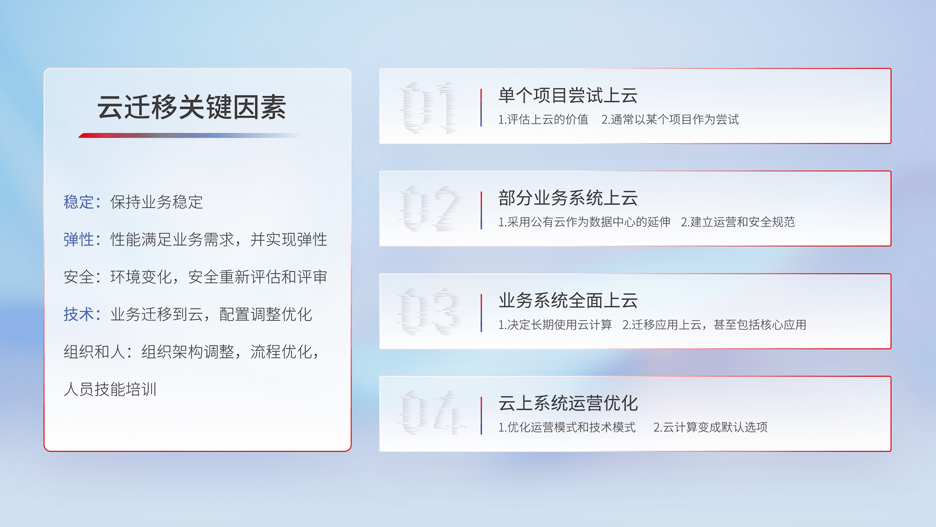 结合实际业务,,,,从规划设计、、、云平台选型、、云原生改造、、数据迁移、、集成交付,,,迁移全过程为客户识别最佳上云路径,,做好风险识别管理,,,,设计网络架构、、、身份权限、、、安全审计合规、、操作审计、、、、日志审计、、、监控告警策略、、多站点容灾设计等,,,,对云上基础设施进行整体规划,,,,提升IT治理水平,,以满足弹性、、、高可用、、、、高性能的需求。。。
