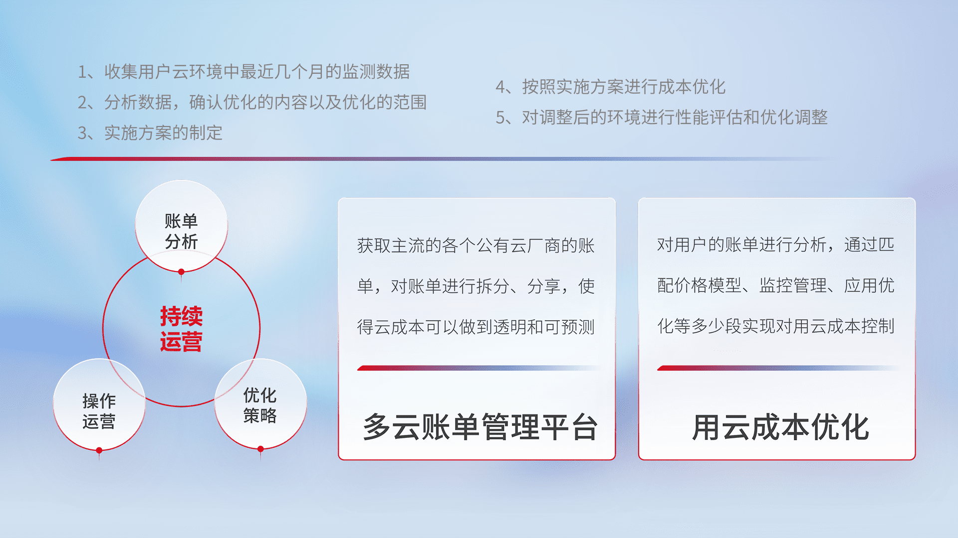 通过多云纳管,,,,以统一的资源数据模型把客户的云资源进行抽象和封装,,,,进而实现对多云资源的统一操作,,,保障云资源管理的可靠性、、、稳定性与可用性。。。。量身定制化运维内容,,,,配置、、、、开发运维、、、补丁管理、、、备份、、、监控、、、、认证和访问管理、、、、审计和日常巡检等,,保障在用云过程中的可靠度,,,稳定度以及高可用率。。。。